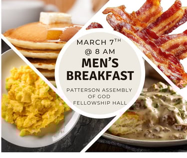 Men's Breakfast - Saturday, MAR 7th at 8AM (Patterson Assembly of God Fellowship Hall / Great Breakfast, Fellowship & Devotion)