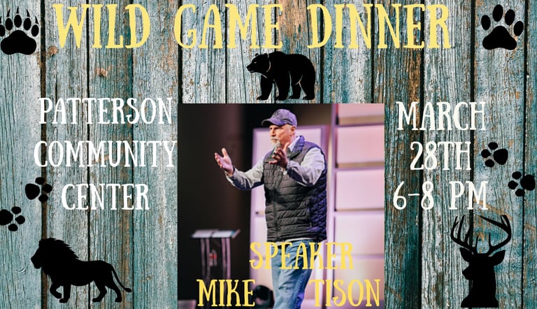 WILD GAME DINNER - Saturday, MAR 28th at 6PM (Patterson Community Center / Give-a-ways / National Speaker - Michael Tison)