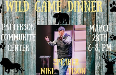 WILD GAME DINNER - Saturday, MAR 28th at 6PM (Patterson Community Center / Give-a-ways / National Speaker - Michael Tison)