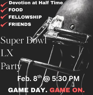 Super Bowl Party - Sunday, FEB 8th at 5:30PM (Patterson Assembly of God Fellowship Hall / Devotion at Half Time / Food & drinks)